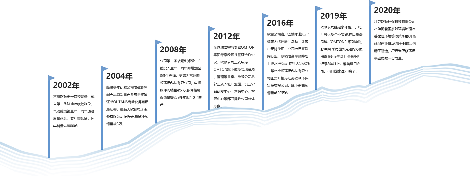 江蘇歐頓環(huán)保科技有限公司是一家專業(yè)從事袋式除塵器配件研發(fā)、生產(chǎn)、銷售和環(huán)保技術(shù)相關(guān)的企業(yè)。公司通過國家相關(guān)產(chǎn)品認(rèn)證企業(yè)、質(zhì)量等認(rèn)證企業(yè),公司擁有袋式除塵器技術(shù)研發(fā)中心、實驗中心、檢測中心等配套實施。我們以全球科技發(fā)展為導(dǎo)向,2014年通過與國外知名工業(yè)清潔空氣凈化專業(yè)企業(yè)進(jìn)行合作,引進(jìn)先進(jìn)的空氣凈化技術(shù)和先進(jìn)的產(chǎn)生、管理模式,投入大量資金對電磁脈沖閥膜片和除塵濾料產(chǎn)品進(jìn)行研發(fā),并獲得顯著成果,使得歐頓產(chǎn)品在國內(nèi)市場占有一席之地,產(chǎn)品質(zhì)量媲美國外產(chǎn)品,使得歐頓公司在袋式除塵行業(yè)起到跨越性作用。我們的產(chǎn)品包括電磁脈沖閥、脈沖噴吹控制儀、除塵濾袋、除塵袋籠、除塵器專用氣缸、專用配件、電氣控制柜及過濾筒、氣動助流產(chǎn)品等。其袋式除塵產(chǎn)品廣泛應(yīng)用于電力、冶金、建材、垃圾焚燒、化工等行業(yè)。在過去的數(shù)年里,公司的產(chǎn)品和服務(wù)得到了市場的認(rèn)可及肯定,產(chǎn)品出口到數(shù)十個國家。