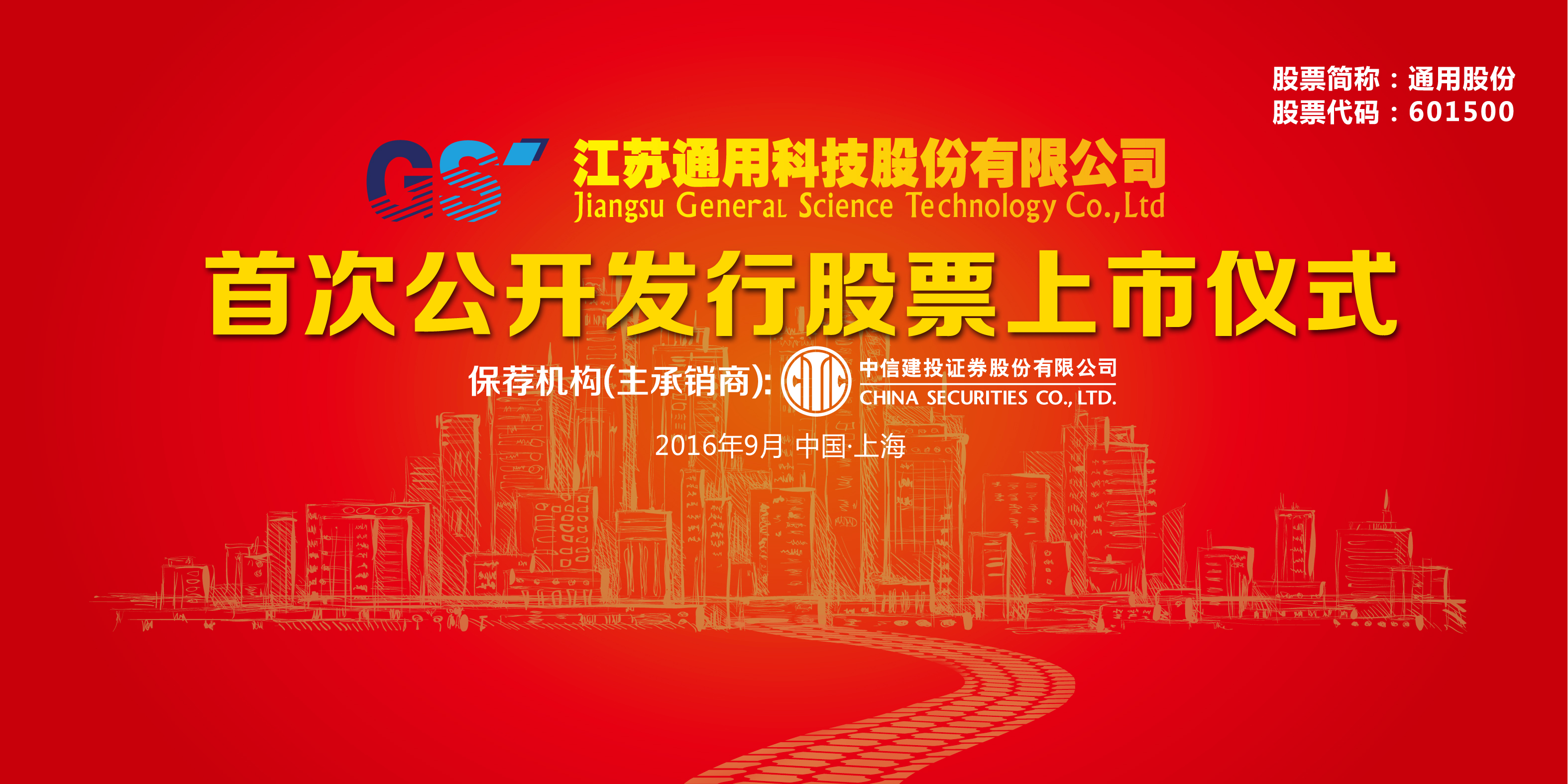 9月19日,江蘇通用科技股份有限公司首次公開發(fā)行A股上市儀式在上海證券交易所隆重舉行,隨著開市鳴鑼,標(biāo)志著通用股份(股票代碼:601500)